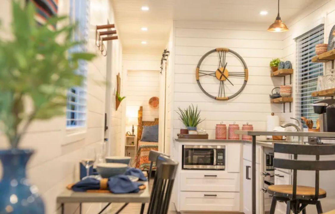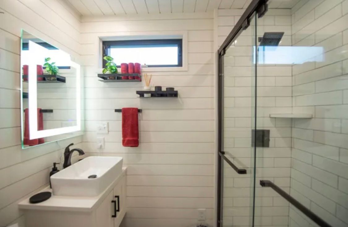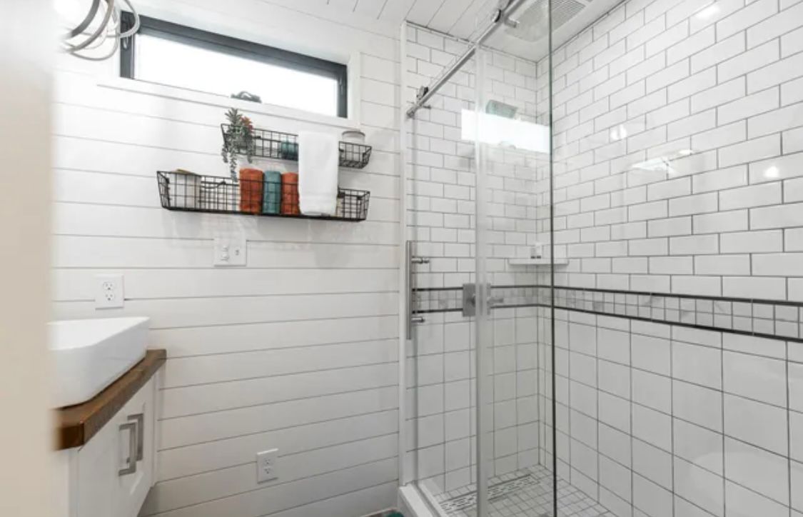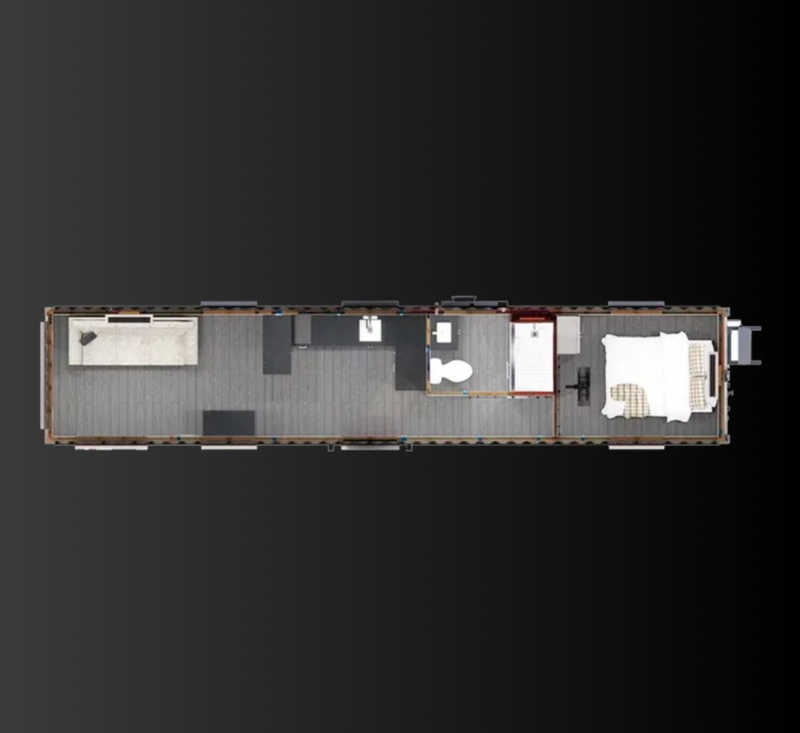 Cette maison contenante de 12 mètres dispose d’une chambre privée spacieuse conçue pour un lit queen, d’une cuisine entièrement équipée avec de élégants plans de travail en quartz, et d’un espace de rangement abondant. À l’intérieur, profitez de boiseries en bois massif en bois de vaisseau et de moulures rustiques en bois de grange en option. Améliorez le confort avec une terrasse sur le toit en option, entourée d’un élégant système de rampe en câble en acier inoxydable pour une détente en plein air et une vue panoramique.